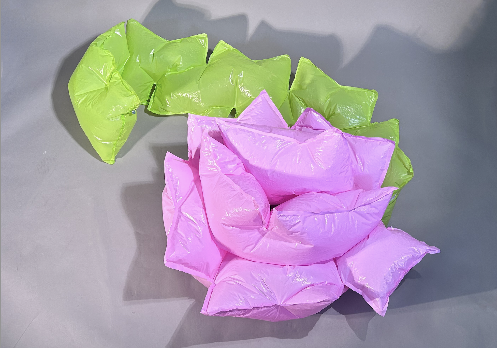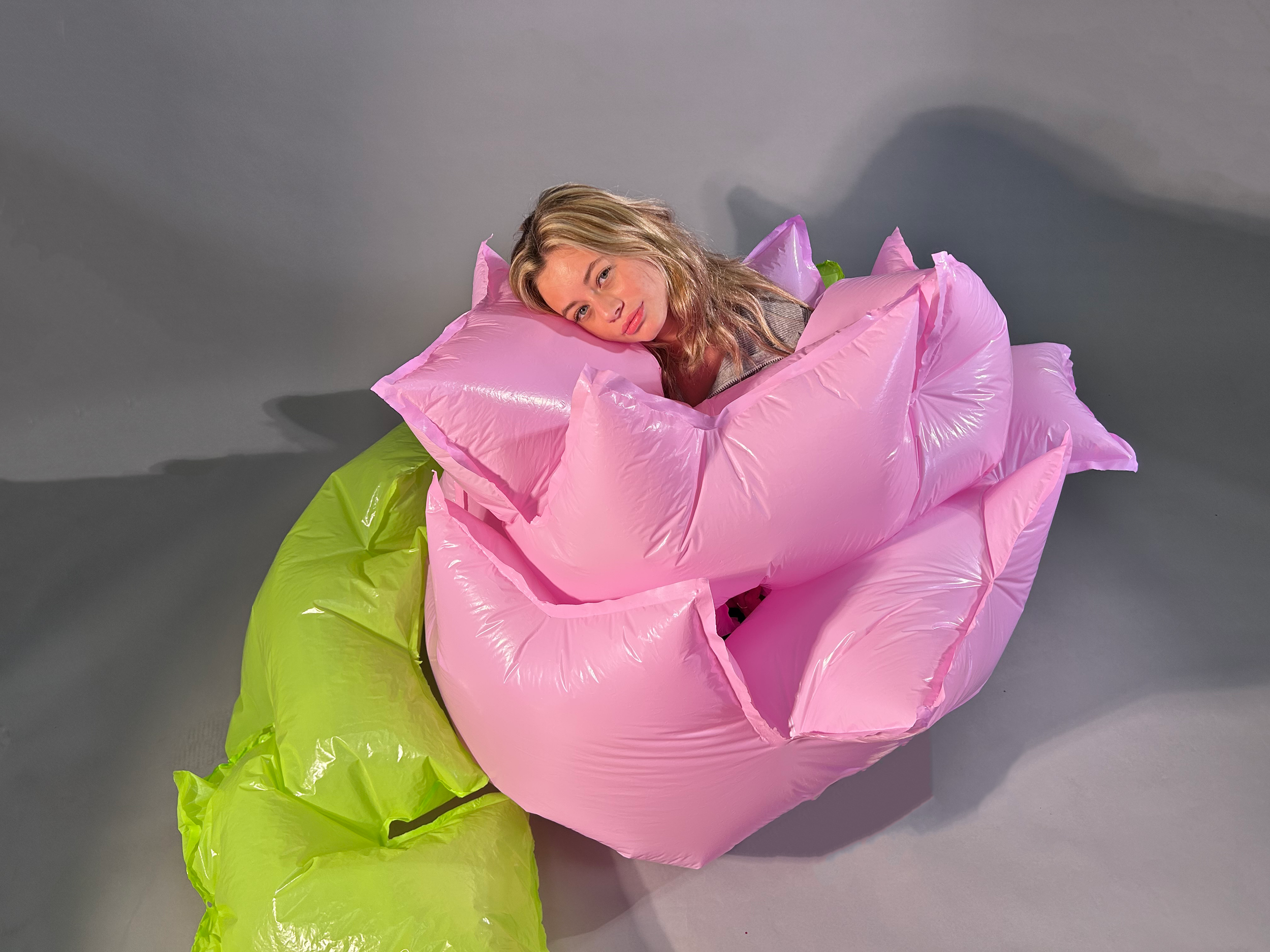 After extensive brainstorming and prototyping, we decided to create an inflatable flower. This unique design comes together as a single piece, making it incredibly easy to inflate. The flower's versatile structure allows it to be used in multiple ways, providing the user with a variety of comfortable sitting positions.
